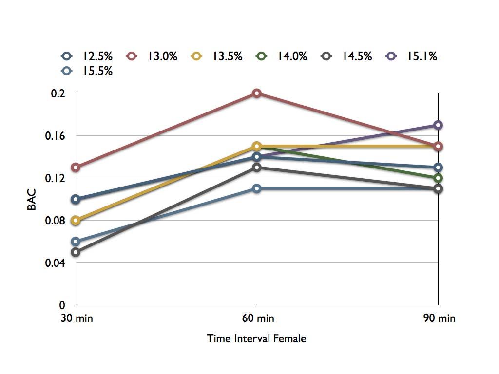 (1) When the same wines were tested for Male 1 and Female, the Female had consistently higher BAC at