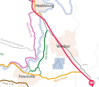 and Forestville. The western boundary is roughly marked by Westside Road and the eastern limit by Eastside