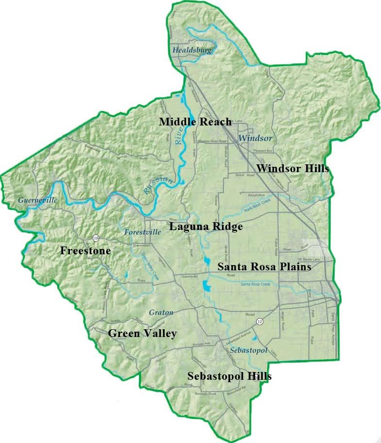 four corners consisting of the towns of Healdsburg and Guerneville in the North and Sebastopol and Santa