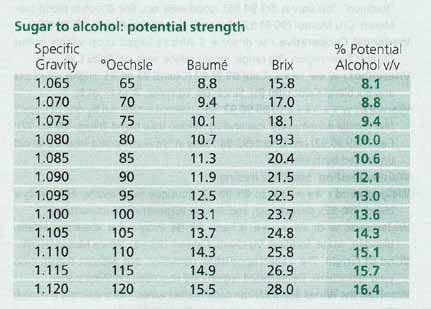 Answer: The sugar to alcohol potential strength was obtained from the following chart. The chart