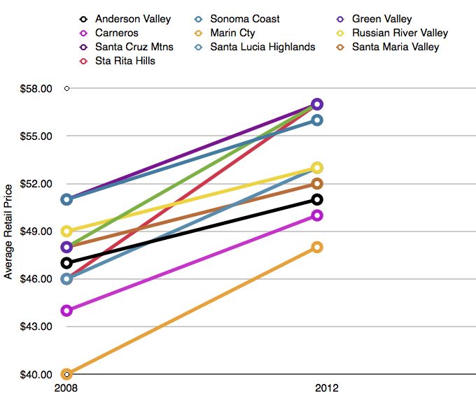 $47, 2010 $49, 2011 $50, 2012 $50. Remember, these are primarily ultrapremium Pinot Noirs. Although this
