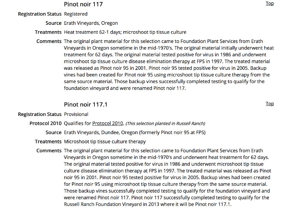were advanced to FPS Pinot noir 117, and are now available from FPS. The backup vines completed testing to