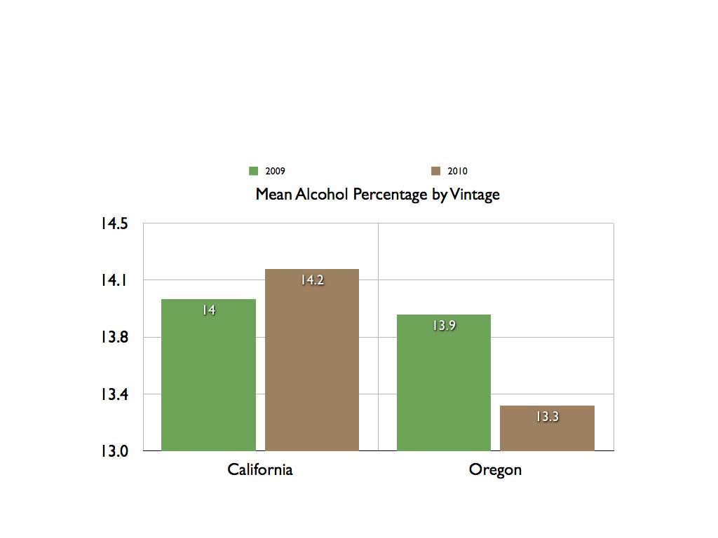 percentages for California Pinot Noir ranged from 12.8% to 15.8% with a mean of 14.2%, and for Oregon Pinot